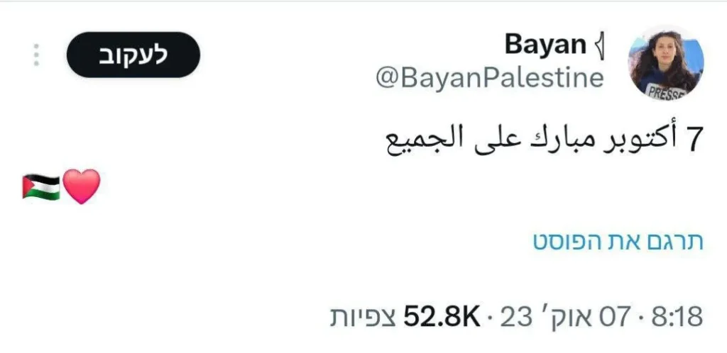 Il 7 ottobre 2023, il giorno dell’attacco di Hamas contro Israele – il più cruento dopo la Shoah – la giornalista palestinese Bayan Abu Sultan pubblica su X (ex Twitter) un messaggio in lingua araba: